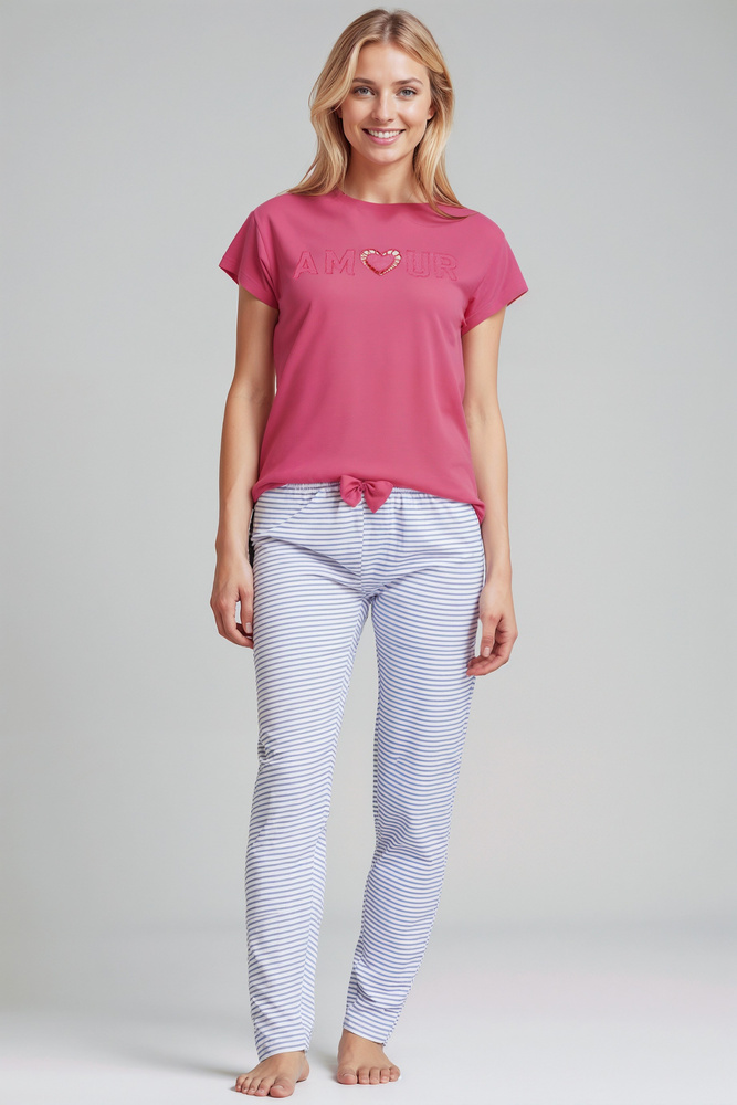 Piżama damska Juliana Sorbetto różowa – bawełniana, z haftem i spodniami w paski