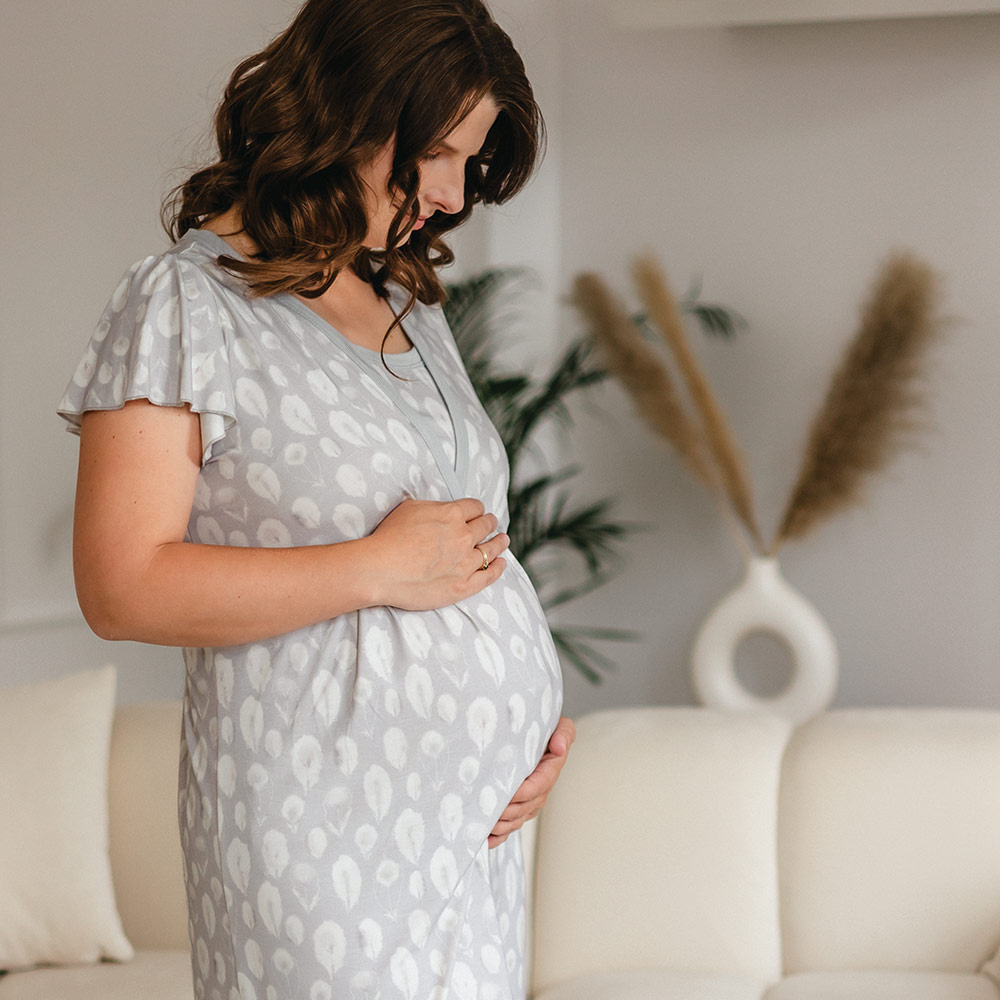 Subtelny wzór w delikatne piórka i luźny fason zapewniają komfort i kobiecy wygląd – niezależnie od etapu macierzyństwa.