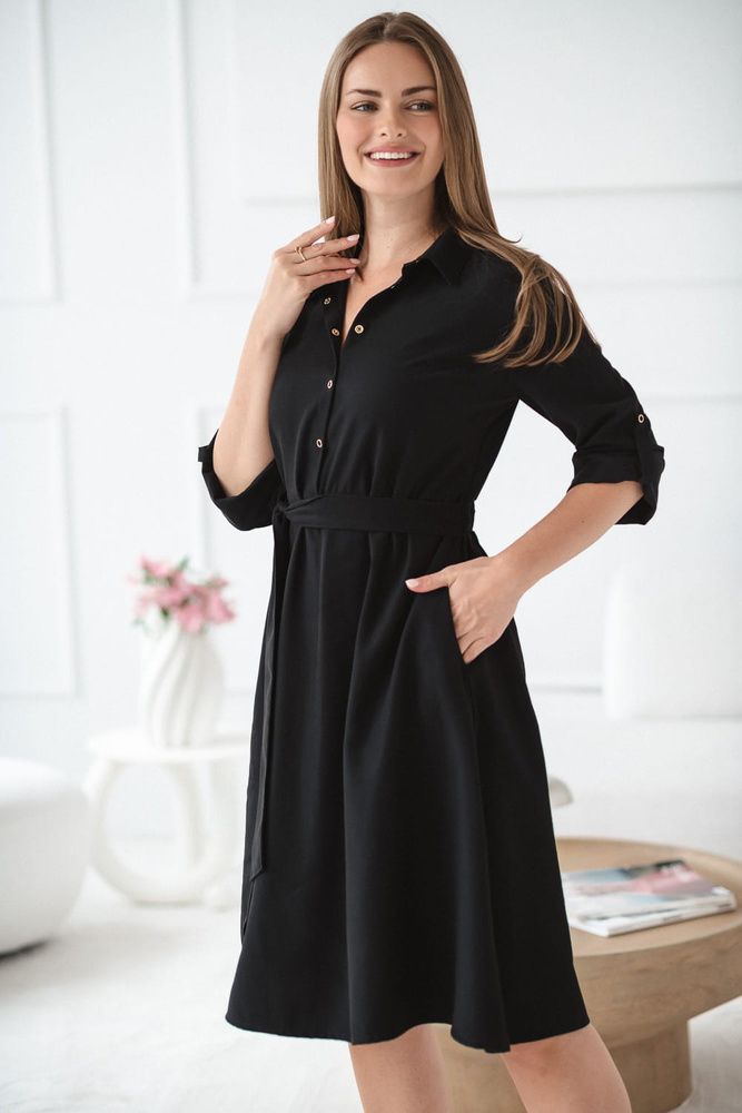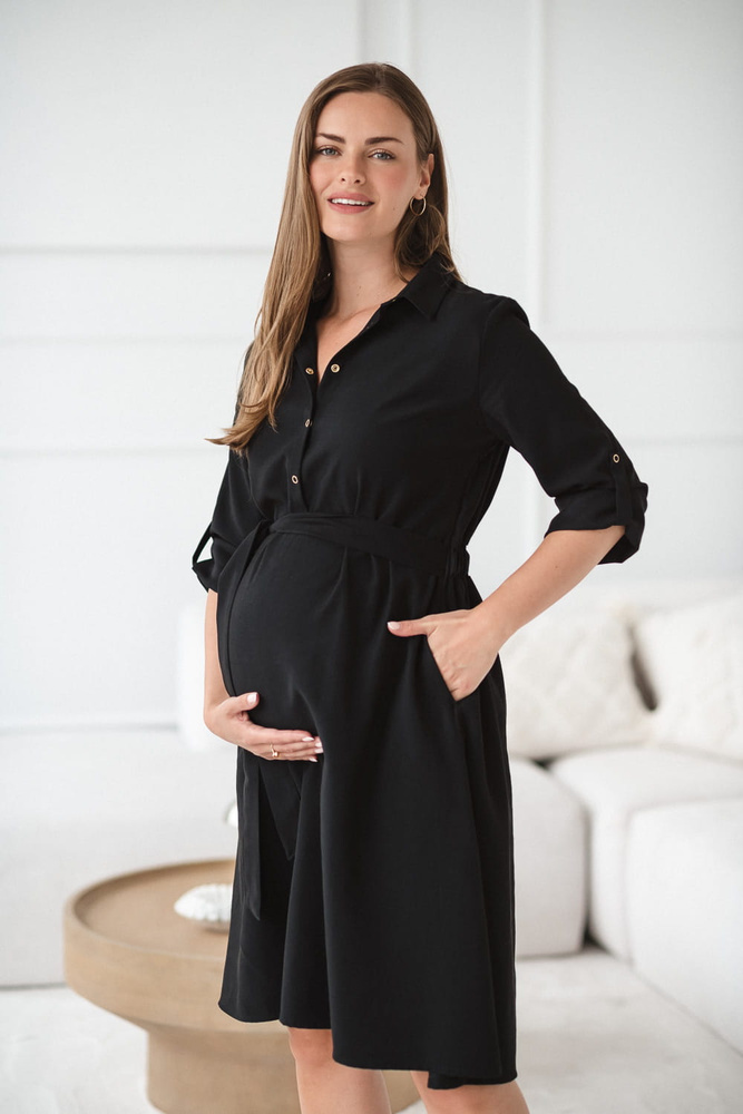- Czarna sukienka ciążowa i do karmienia – elegancka, przewiewna i bardzo kobieca. Napy, rękaw 3/4 i pasek dopasowujący sylwetkę.