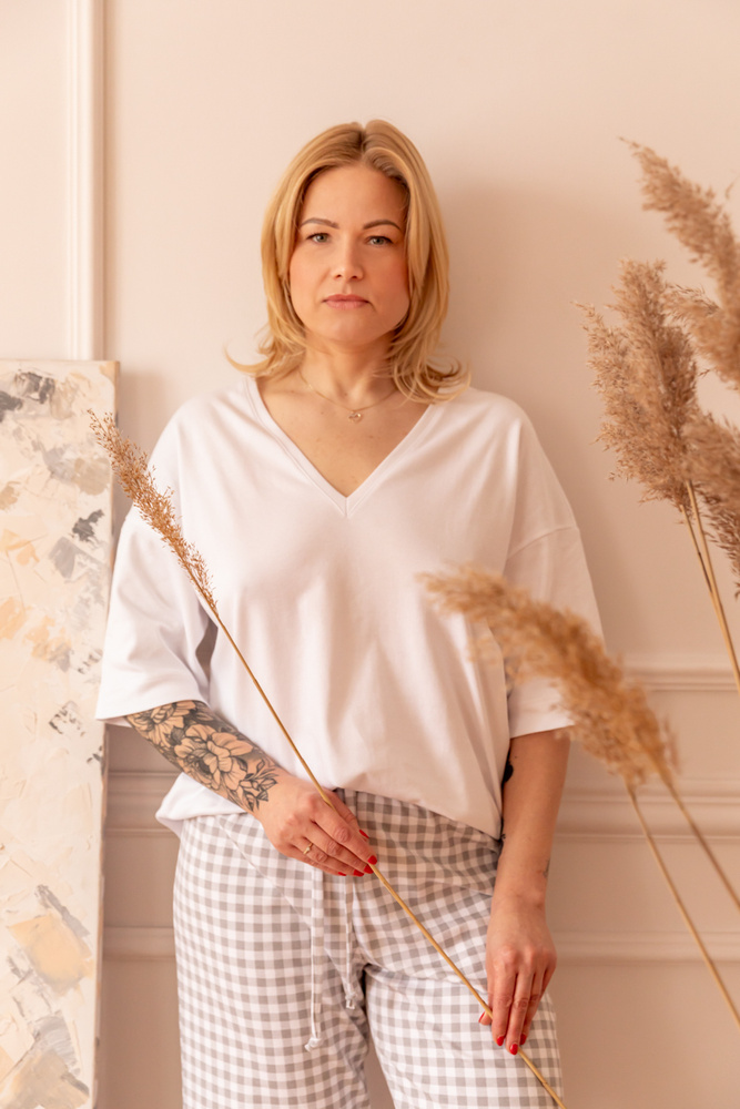 Poznaj piżamę 38L Lidia Marija – model stworzony z myślą o wygodzie i nowoczesnym designie. Luźna, biała góra z krótkim rękawem i dekoltem V świetnie komponuje się ze spodniami w szaro-białą kratkę, tworząc ponadczasowy zestaw.