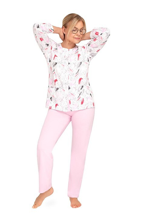 - Komfortowa piżama damska Martel Maria III 202 z bawełny. Koszulka na guziki z długim rękawem i wzorem, spodnie jednolite z gumką w pasie.