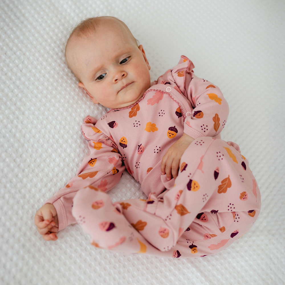 Model posiada długi rękaw, ozdobne falbanki na ramionkach oraz stylowy jesienny nadruk. Kopertowe zapięcie na boku oraz napki w kroku ułatwiają przebieranie i zmianę pieluszki bez stresu dla dziecka.
