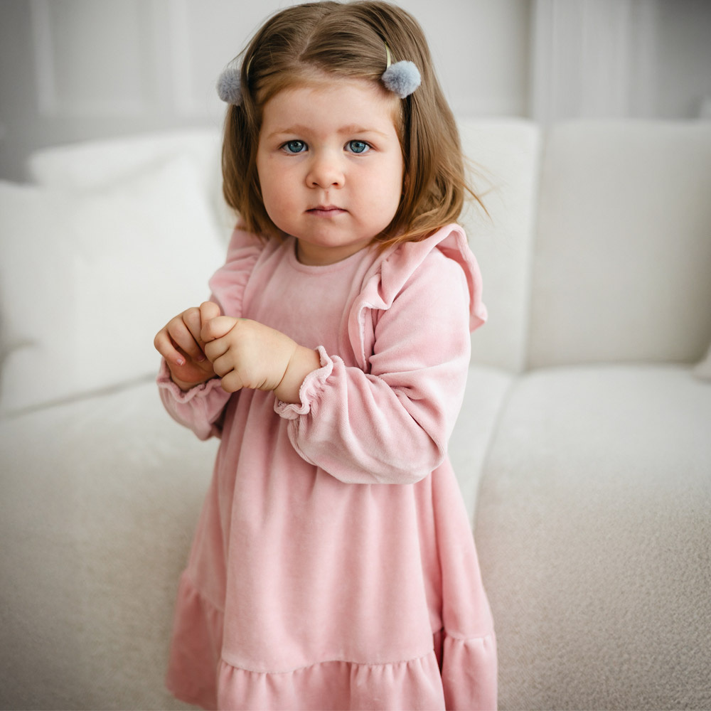 - Stylowa sukienka niemowlęca z kolekcji Fluffy Tails. Miękki welur, falbanki na ramionkach, długi rękaw z ściągaczem. Idealna na jesień i zimę.