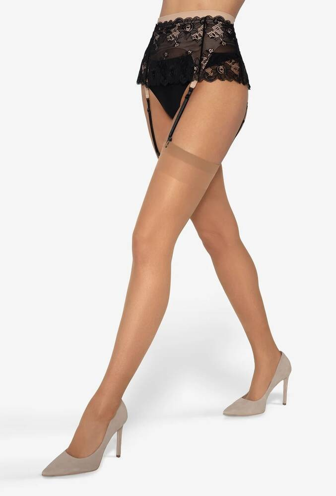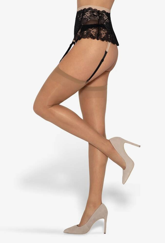 Pończochy damskie do paska, wykonane z przędzy typu Stretch. Pakowane po dwie pary.