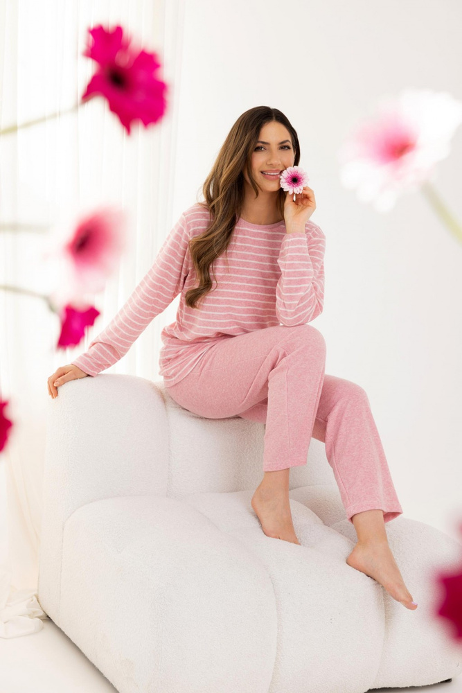Ciepła piżama damska Regina 713 różowa – frotte, paski, bawełna z poliestrem