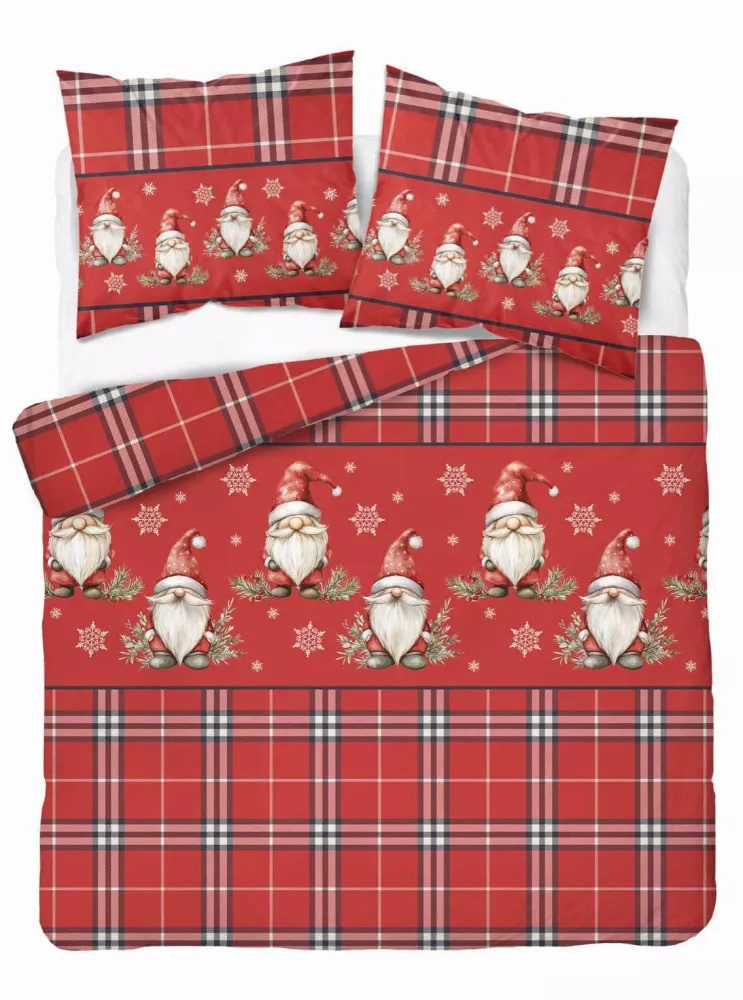5622 A Magia Świąt Detexpol Pościel świąteczna flanelowa czerwona w kratę ze skrzatami i śnieżynkami – bawełna 100%, certyfikat OEKO-TEX®