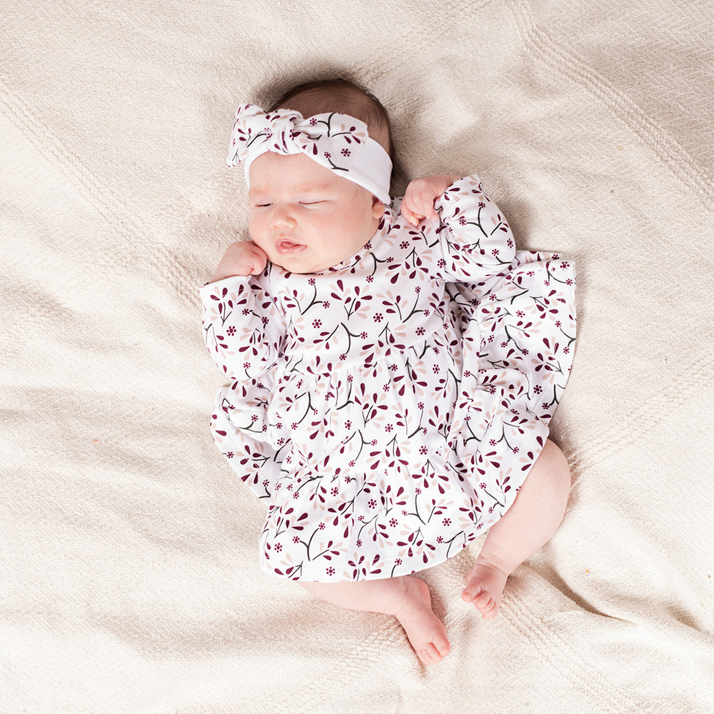 Wykonane z miękkiej bawełny, sukienko-body jest przewiewne i miłe w dotyku. Wzór w delikatne gałązki i kwiatki dodaje dziewczęcego uroku, a napy w kroku ułatwiają przewijanie. To idealne ubranko na co dzień i na wyjątkowe okazje.
