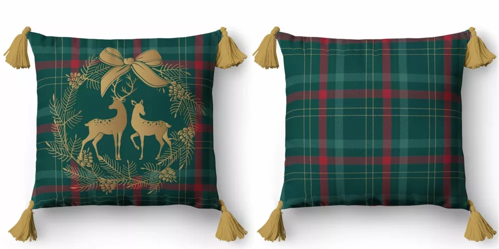 5380 A Christmas Deco Detexpol renifer w wieńcu na tle kratki– poszewka dekoracyjna świąteczna 45x45, Panama, zamek błyskawiczny
