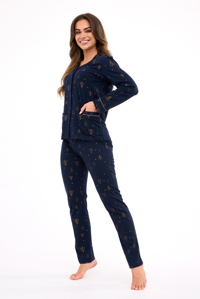 • Cornette Gold 482/447 – piżama damska. Bawełna 100%, koszula na guziki, spodnie z kieszeniami, granatowy kolor, pudełko prezentowe.