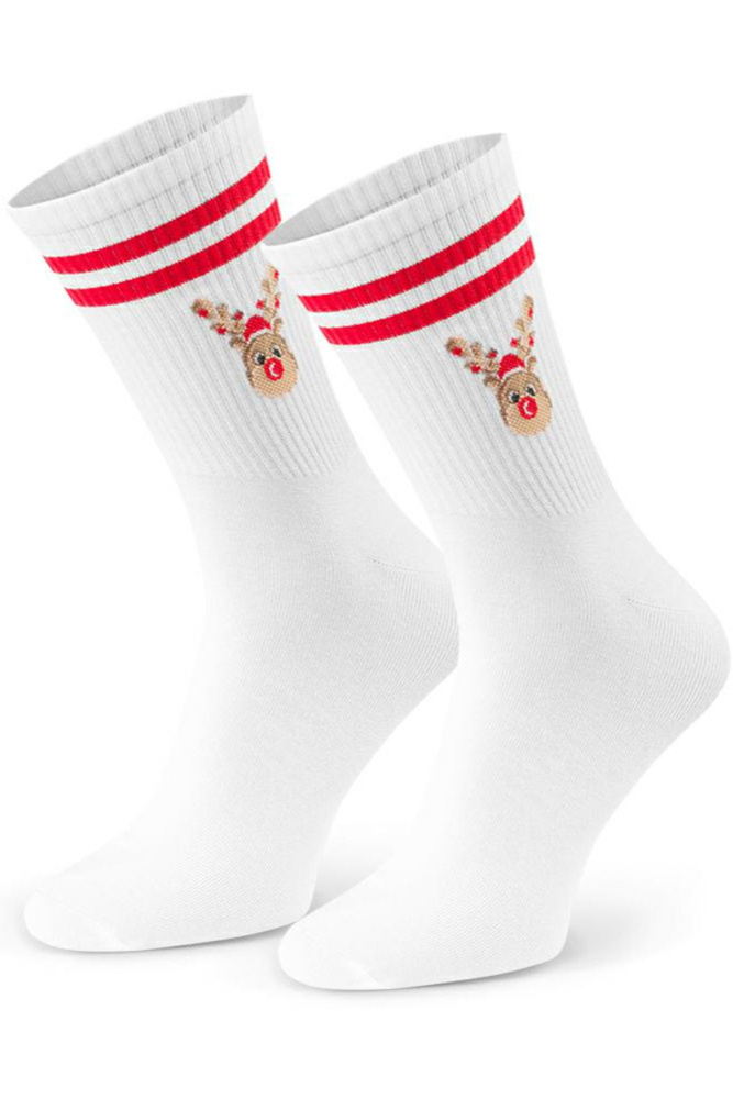 Skarpety zdobią oryginalne, świąteczne motywy, które przyciągają wzrok i wprowadzają wyjątkowy nastrój. Dzięki elastycznemu wykończeniu dobrze trzymają się na stopie, zapewniając komfort noszenia bez ucisku.