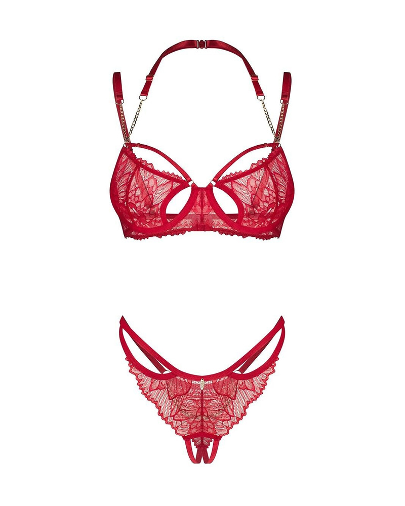 - Komplet Obsessive Matildea: elegancki biustonosz z fiszbinami i otwarte stringi z koronką. Regulowane zapięcie na plecach.