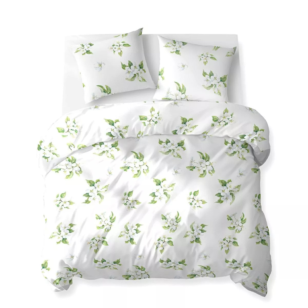 Detexpol Cotton Bloom 5766 B pościel bawełniana biała w białe kwiaty z zielonymi liśćmi– dwustronna, naturalna, 100% bawełna