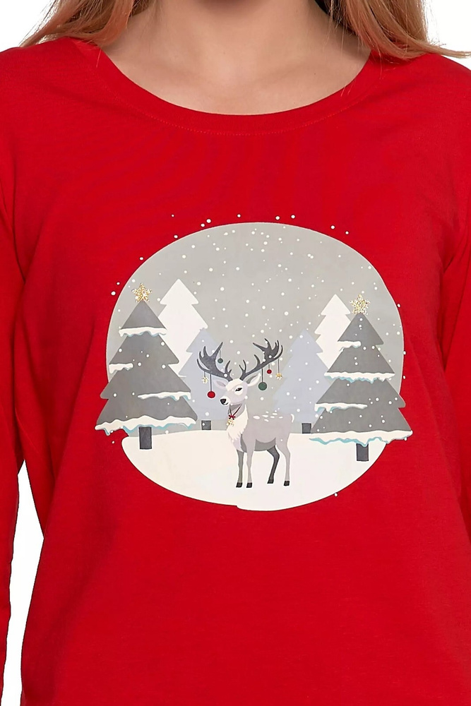Stylowa piżama z naturalnej bawełny to idealny wybór dla kobiet ceniących komfort i prostotę. Koszulka z długim rękawem i okrągłym dekoltem została ozdobiona kolorowym nadrukiem, który nadaje jej radosnego charakteru.