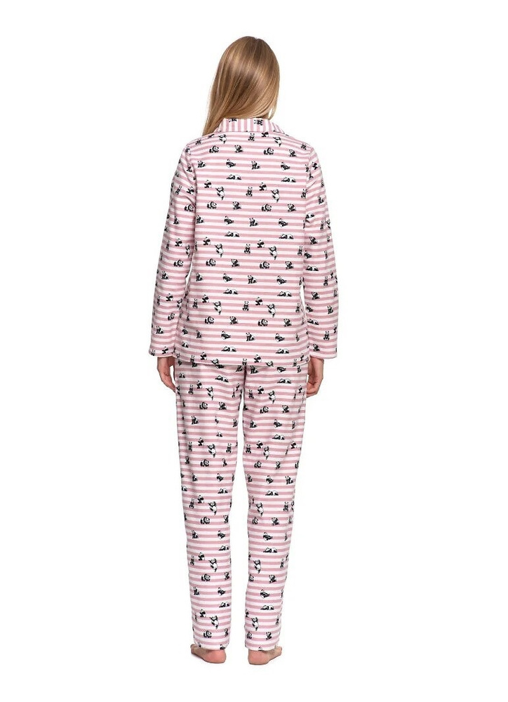 - Damska piżama Moraj PDD6300-002. Bawełniana flanela z motywem pandy, koszula na guziki i długie spodnie z kieszeniami.