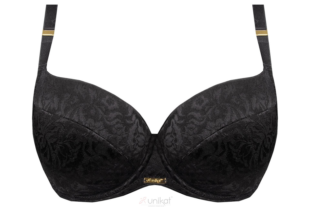 - Stylowy biustonosz Unikat Madera z pełnymi miseczkami. Czarna koronka, złote detale i wygodne ramiączka zapewniają elegancję i komfort każdego dnia.