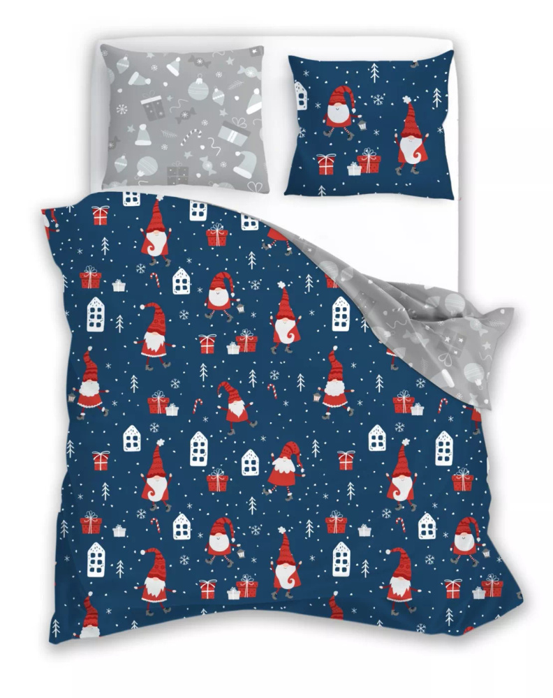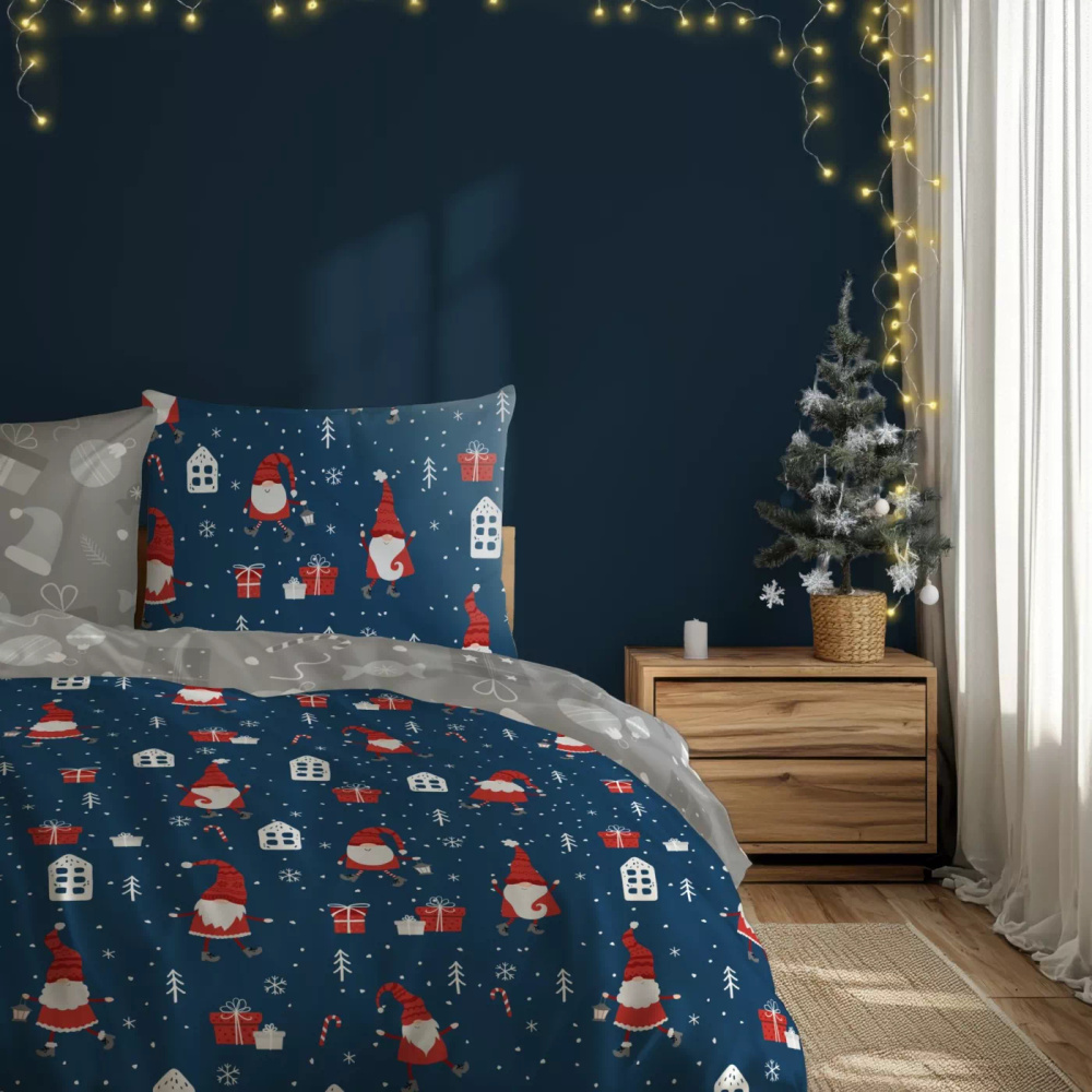 Scandic 081 Scandic Faro granatowo-szara ze skrzatami  – pościel świąteczna dwustronna, bawełna 100%, komplet