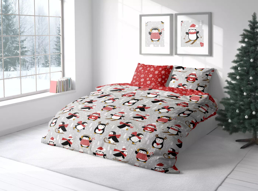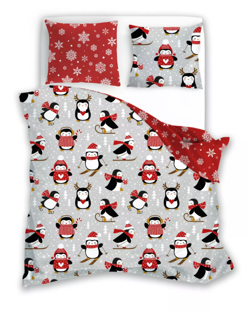 Scandic 076 Scandic Faro szaro-czerwona z pingwinami – pościel świąteczna dwustronna, bawełna 100%, komplet