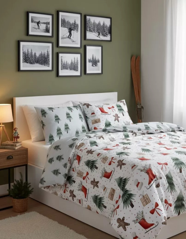 Dwustronny wzór pozwala odmieniać wygląd sypialni w kilka chwil, a świąteczna stylistyka nada wnętrzu ciepłego i wyjątkowego klimatu. Świetnie sprawdzi się jako prezent pod choinkę.
