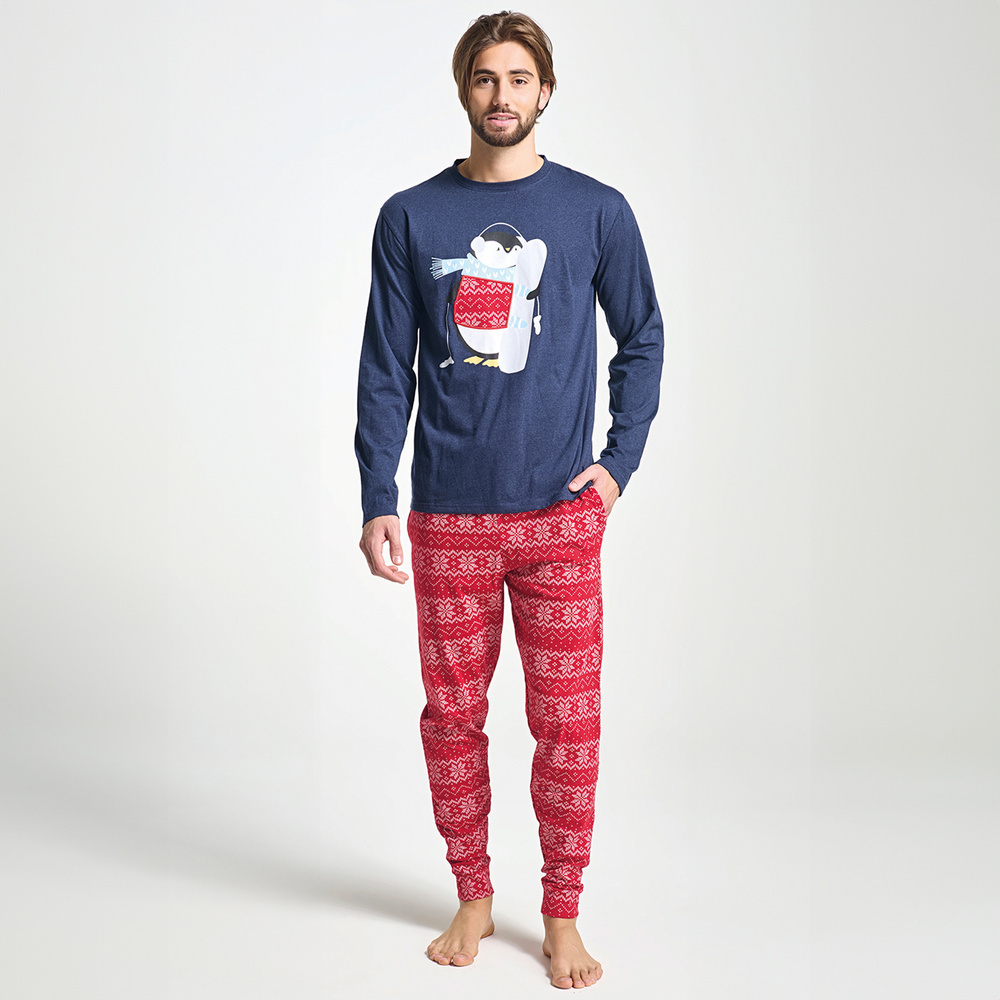 • Piżama męska Albano Sorbetto z granatową bluzą i czerwonymi spodniami w śnieżynki. Bluza z nadrukiem pingwina i haftem, spodnie z kieszeniami, elastyczną talią i ściągaczami. Wygodna, ciepła i idealna na zimowe noce.