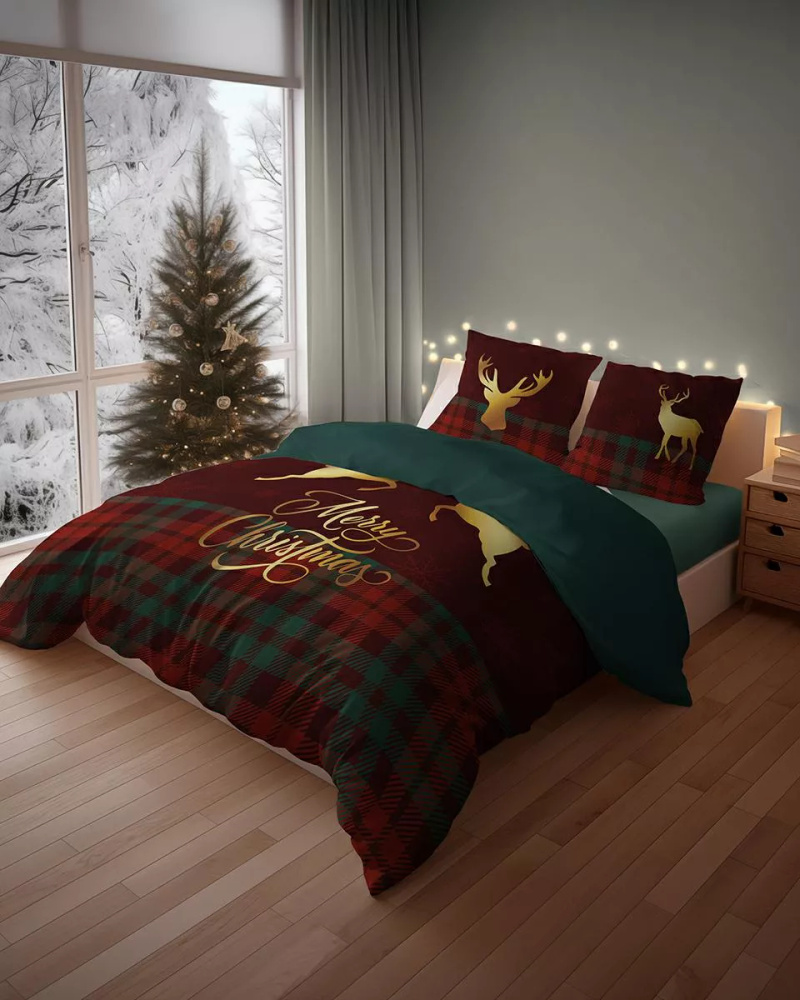 Subtelny, bożonarodzeniowy wzór tworzy ciepły i radosny klimat, a naturalny materiał zapewnia zdrowy i spokojny sen.