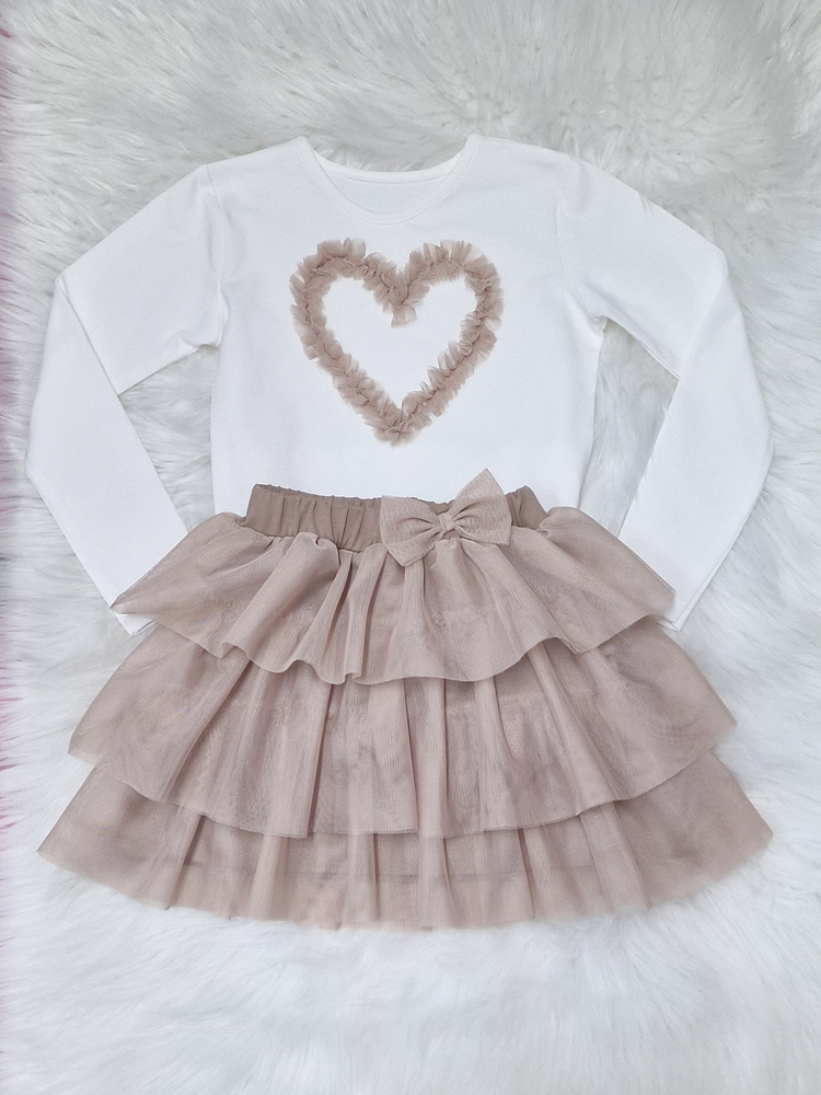 Bambarillo Mia ecru beżowe serce– bluzka dziewczęca z tiulowym sercem, bawełniana