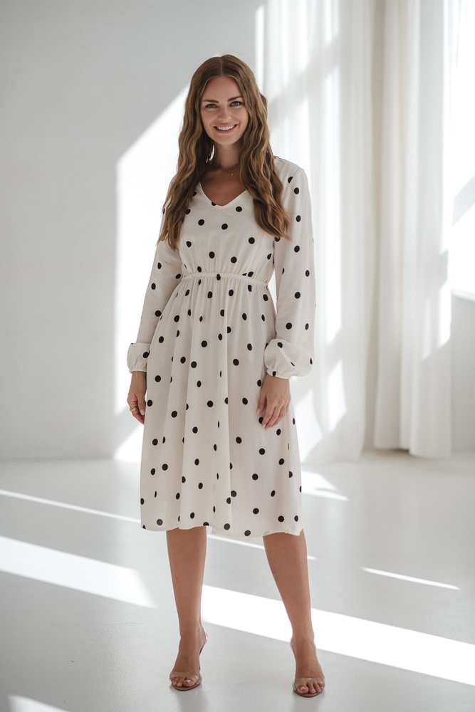 Sukienka ciążowa i do karmienia Lovely Dress Midi Milk&Love kremowa w grochy– naturalna tkanina z lnem, elegancka midi z zamkami do karmienia