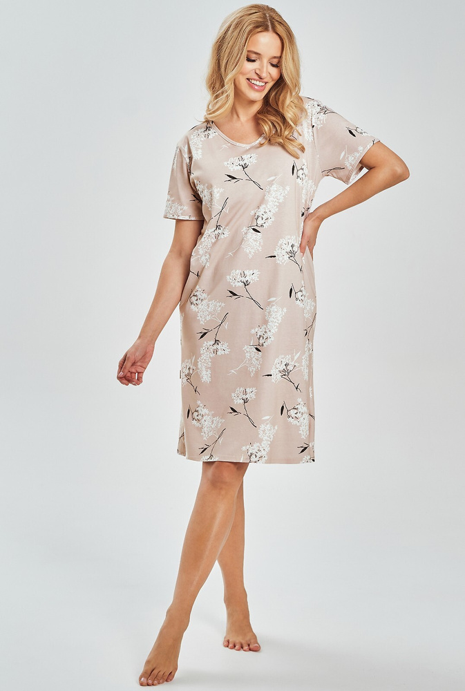 Bawełniana koszula nocna damska Fiora Taro 3538 – roślinny print, do kolan | Naturalny komfort na lato
