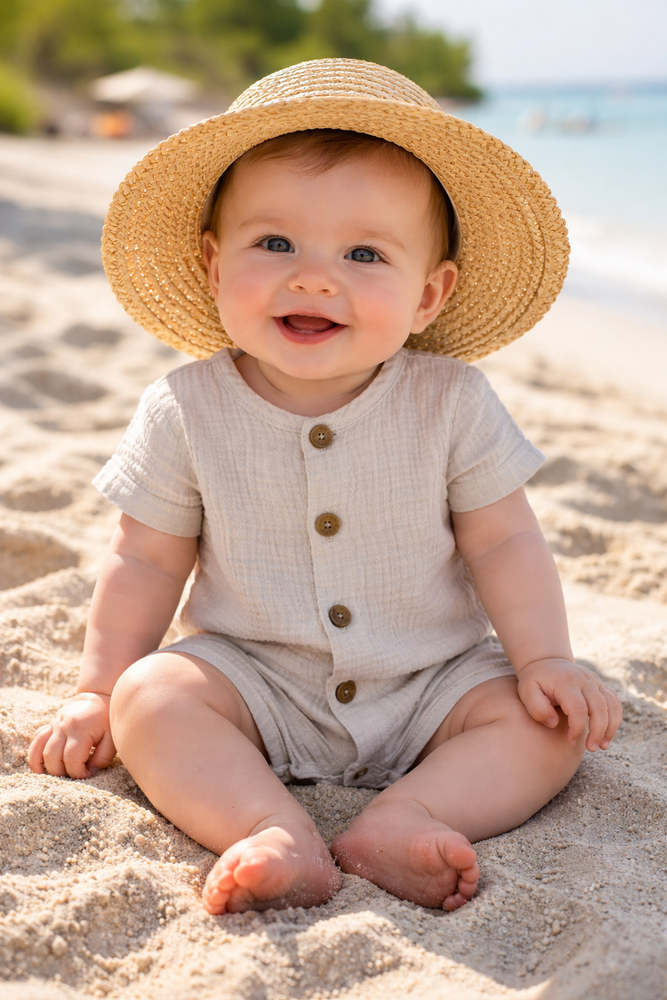 - Letni rampers muślinowy dla niemowląt – lekki, oddychający i wygodny. Naturalna bawełna, guziki i swoboda ruchów na każdy ciepły dzień. Wybierz komfort od pierwszego założenia.