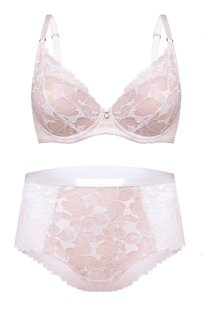 Figi wykonane są z kwiatowej koronki podszytej elastyczną siateczką w neutralnym odcieniu, co sprawia, że są komfortowe i praktyczne w codziennym użytkowaniu. Zabudowany przód i szerokie boki dobrze przylegają do ciała, a wysoki stan zwiększa poczucie wygody. Płaska gumka z przodu dopasowuje się do talii bez ucisku, a koronkowe wykończenie z tyłu dodaje całości lekkości i kobiecego stylu.