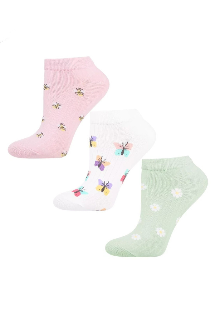 Delikatne motywy – pszczoła, motylek lub rumianek – nadają stopkom lekkości i uroku. Kolorystyka jest stonowana i łatwa do zestawienia z codziennymi stylizacjami. Wzór wybierany jest losowo. Model CSD240-145 to stopki dla kobiet, które cenią prostotę, komfort i detale, które mają znaczenie.