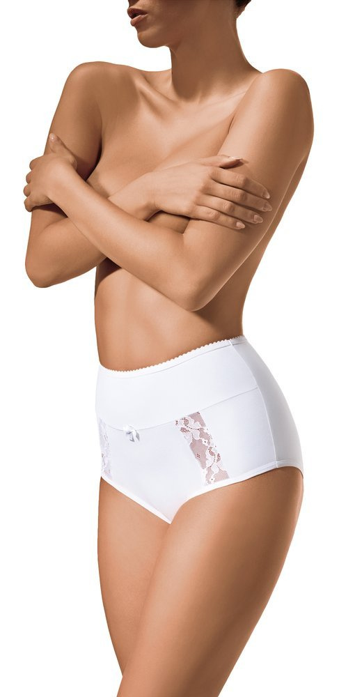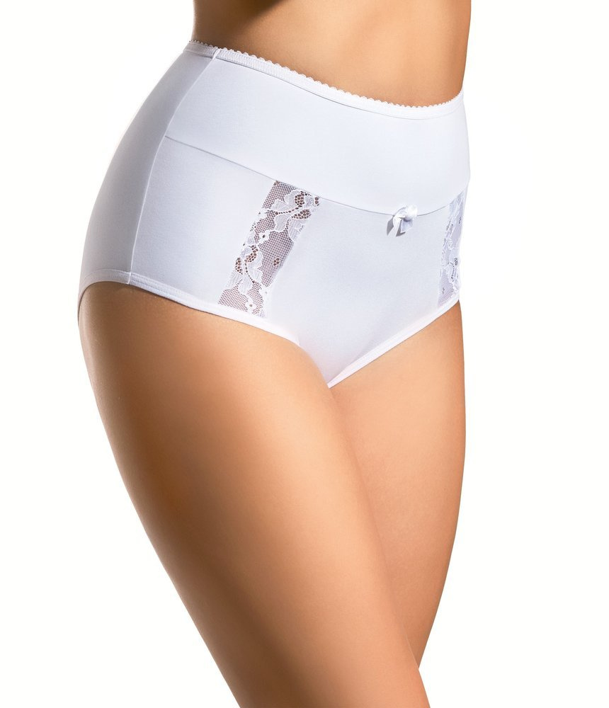 Wysokie figi damskie o klasycznym kroju. Model z delikatnej bawełny. Z przodu, po obu stronach wstawka z delikatnej koronki o kwiatowym motywie, tył gładki. Model pakowany w pudełko. Szczególną zaletą tego modelu jest wysokiej jakości dzianina bawełniana z dodatkiem lycra, przez co idealnie dopasowują się do ciała. Jest to materiał doskonale oddychający i przewiewny.
