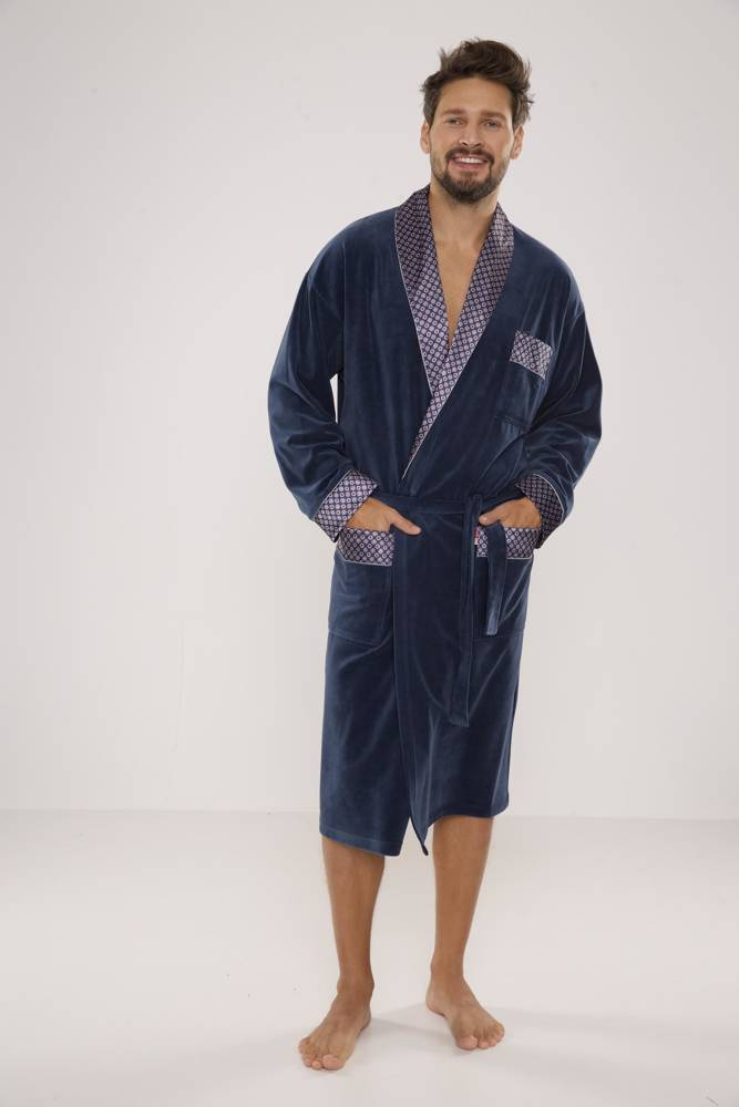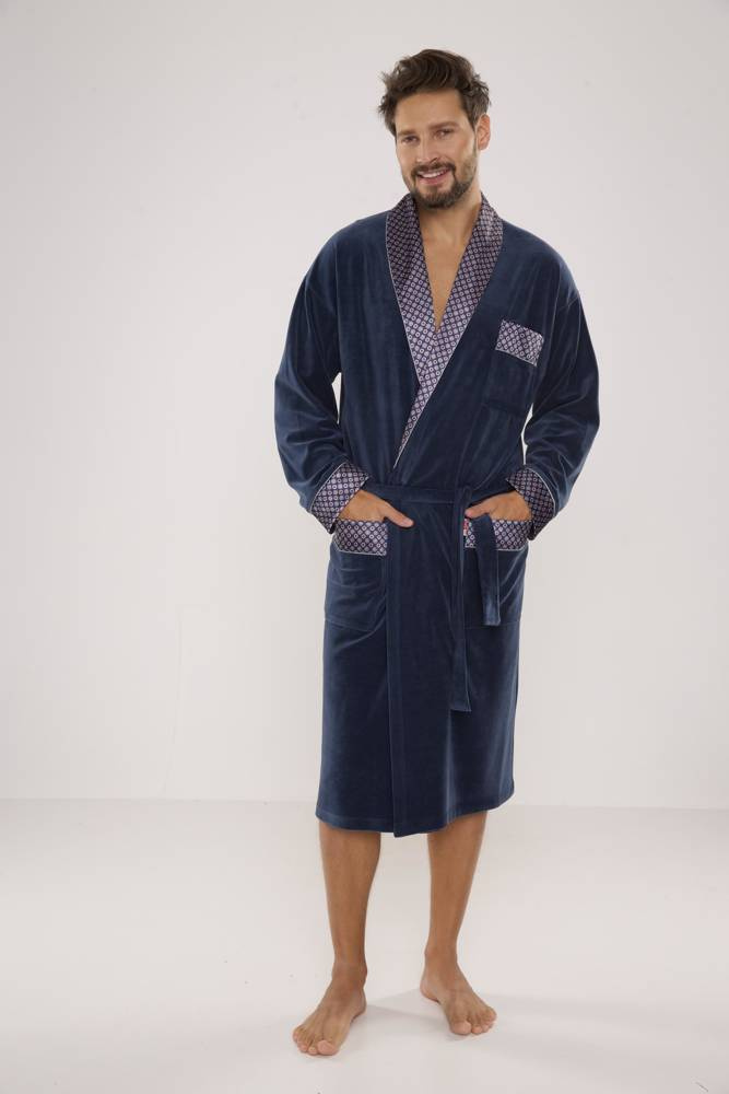 .Długi welurowy szlafrok męski, z szalowym kołnierzem, wiązany na pasek, z dwoma naszytymi kieszeniami i jedną mniejszą na wysokości klatki piersiowej. Mankiety, kołnierz i kieszenie wykończone wzorzystą satyną. Jest on wykonany z 80% bawełny przyjemnej w dotyku idealnie wchłaniającej wodę.