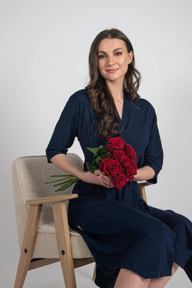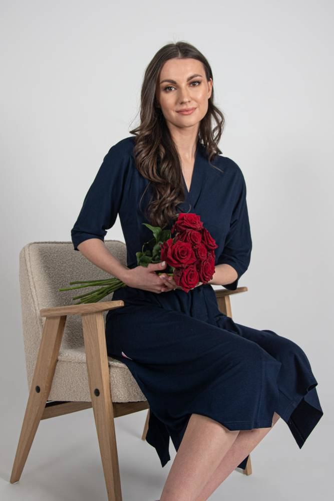 Długość do połowy łydki sprawia, że model wygląda bardzo elegancko, a wiązanie w talii subtelnie podkreśla kształty.
