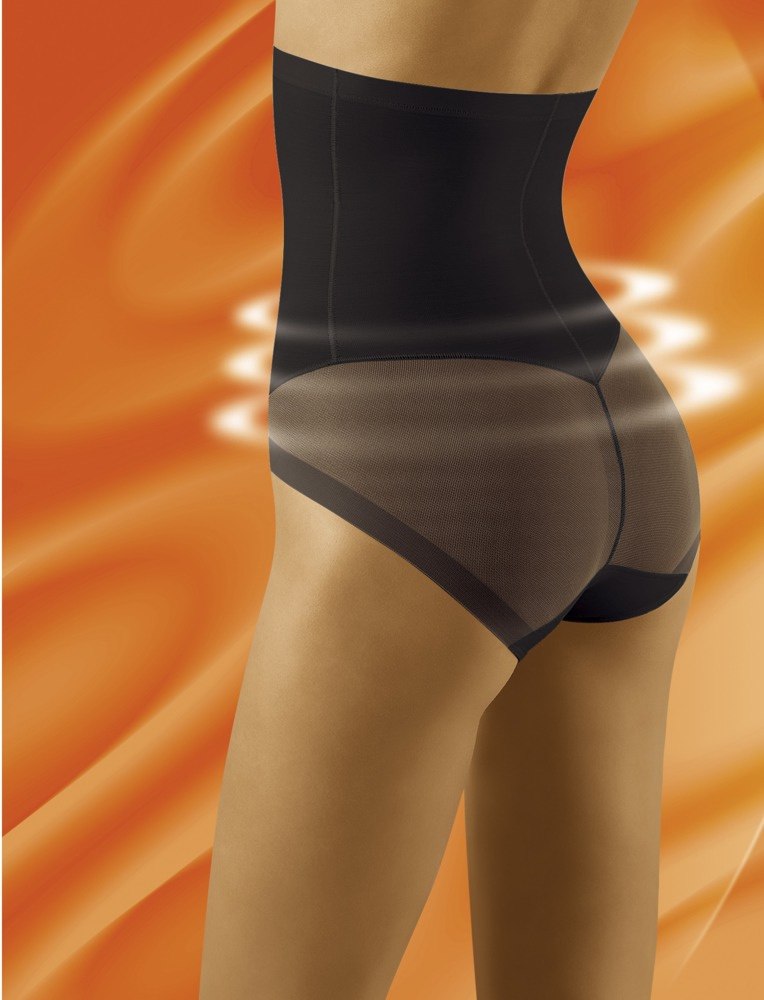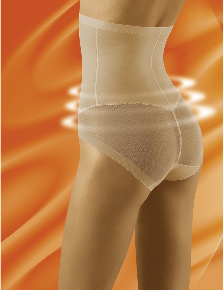 Figi ściągające i korygujące figurę z wysokiej jakości mocno ściągającej dzianiny. Jeden rozmiar mniej bez spłaszczenia pupy. Siateczka zastosowana z tyłu majtek i specjalny krój podnoszą pośladki. Dzięki płaskim wykończeniom bielizna nie odznacza się pod ubraniem. W górnej linii pasa od wewnętrznej strony silikonowa taśma zapobiega zsuwaniu się fig.