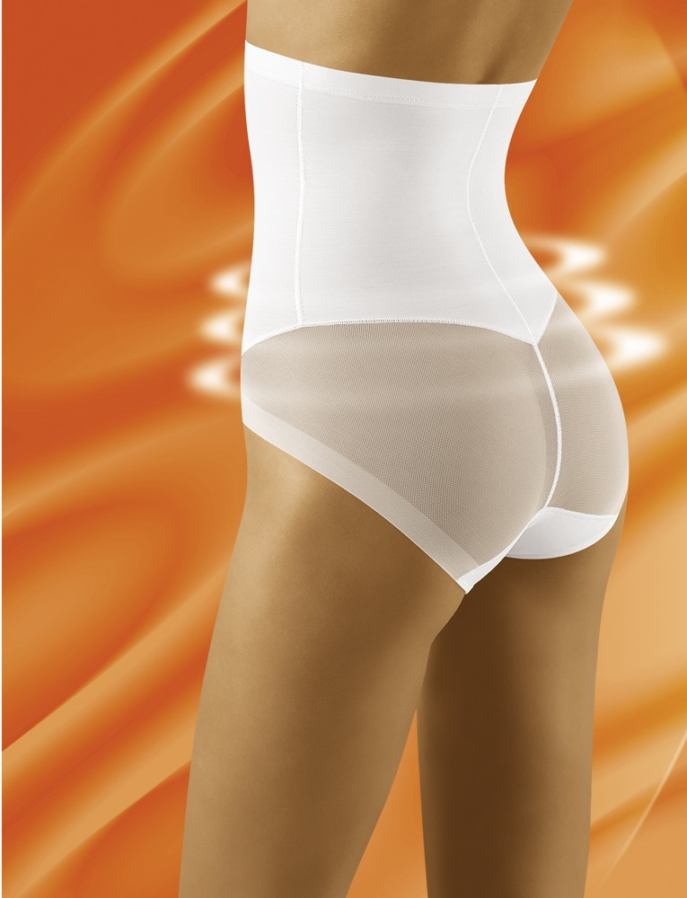 Figi ściągające i korygujące figurę z wysokiej jakości mocno ściągającej dzianiny. Jeden rozmiar mniej bez spłaszczenia pupy. Siateczka zastosowana z tyłu majtek i specjalny krój podnoszą pośladki. Dzięki płaskim wykończeniom bielizna nie odznacza się pod ubraniem. W górnej linii pasa od wewnętrznej strony silikonowa taśma zapobiega zsuwaniu się fig.