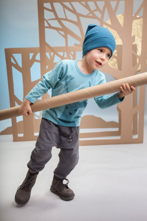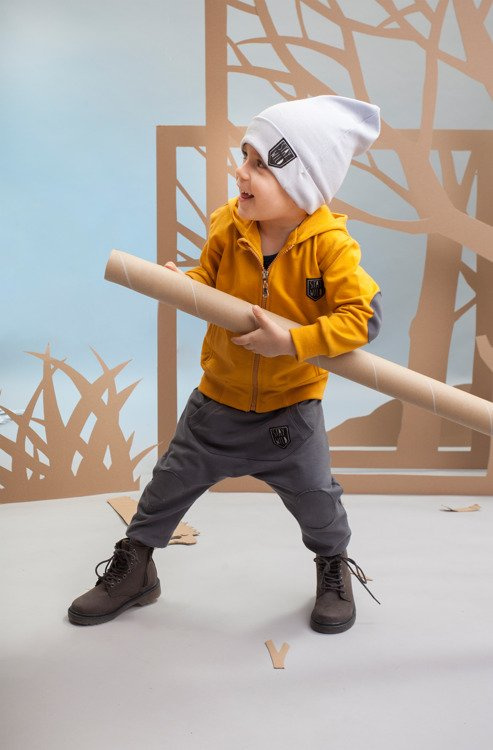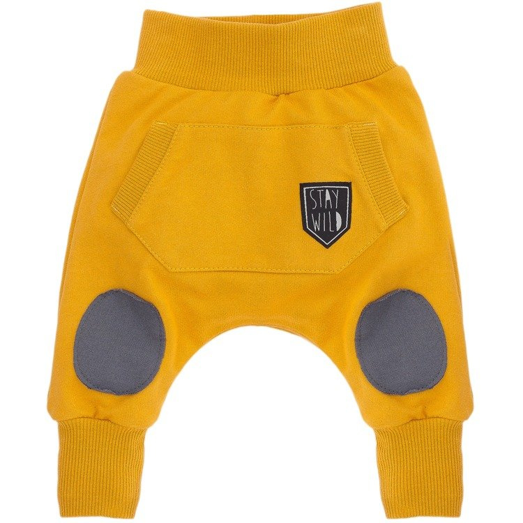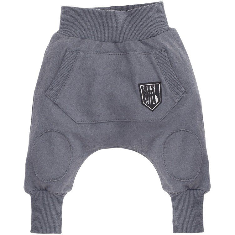 Orginalne pumpy z obniżonym krokiem i kieszenią z przodu, uszyte z bawełnianej dzianiny dresowej. Nogawki i pas wykończone są kontrastowym ściągaczem, w pasie wzmocnione gumą. Dodatkową ozdobę stanowią łaty na nogawkach.