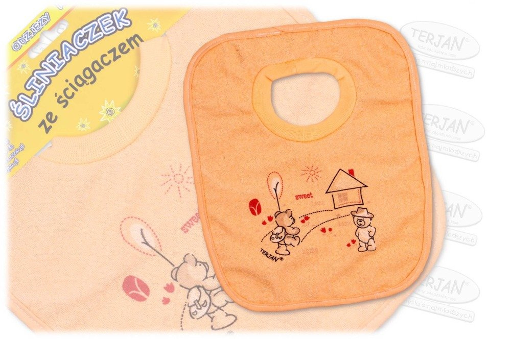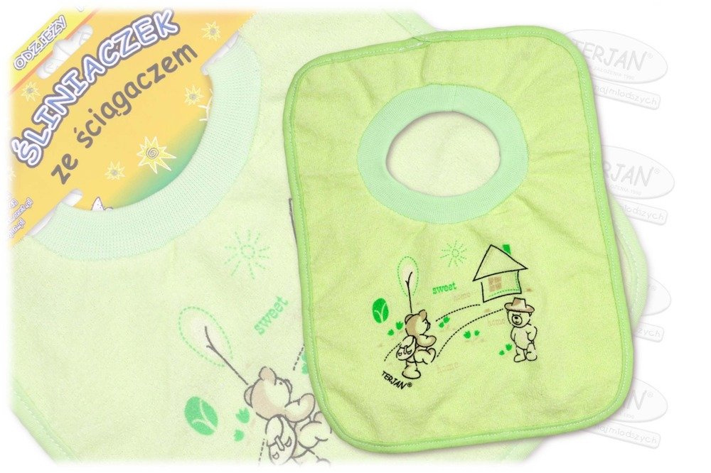Produkt marki Terjan wykonany jest z 100% bawełny frotte. Podszycie śliniaka to miękka nieprzemakalna ceratka, która zabezpiecza ubranie przed zabrudzeniem. Kolorowe nadruki przyciągają uwagę maluszka podczas posiłku. Śliniaczek zakładany jest przez główkę Maleństwa, zamiast tradycyjnego wiązania posiada delikatny ściągacz.