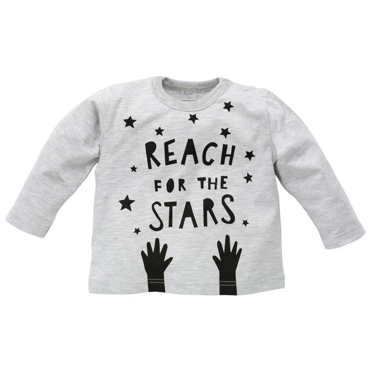 Szara bluzka z ciekawym nadrukiem. Wykonana z najwyższej jakości bawełny wykończona pod szyją delikatną lamówką. Idealna w zestawieniu z pumpami oraz bluzą z kolekcji HAPPY DAY.