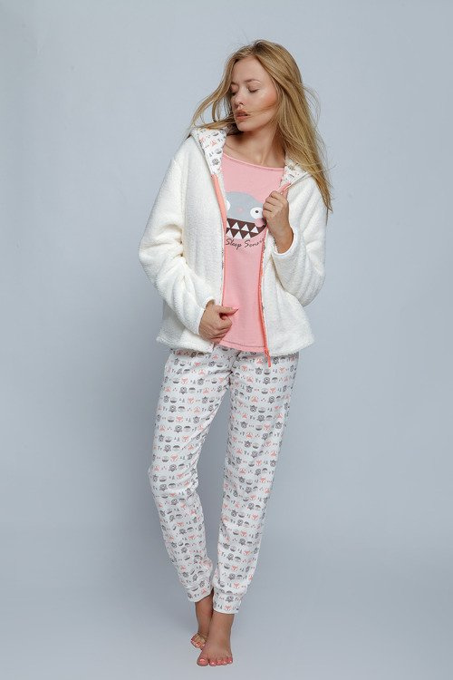 Stylowa piżama damska z wysokiej jakości stuprocentowej bawełny, która w połączeniu z luźnym fasonem daje maksymalny komfort noszenia. Zapewnia pełną swobodę ruchów. Model z rękawem 3/4 - do okolic łokci. Koszulka z okrągłym dekoltem, przód ozdabia stylowy nadruk. Spodnie uszyte z wzorzystego materiału, o prostym fasonie, z długimi nogawkami i gumą w pasie. Bardzo wygodny fason, delikatnie dopasowany do ciała.Spodoba się kobietom, które uwielbiają delikatność i swobodę.
