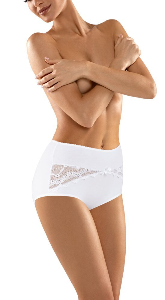 Wysokie figi damskie o klasycznym kroju. Model z delikatnej bawełny. Z przodu, po obu stronach wstawka z delikatnej koronki o kwiatowym motywie, tył gładki. Model pakowany w pudełko. Szczególną zaletą tego modelu jest wysokiej jakości dzianina bawełniana z dodatkiem lycra, przez co idealnie dopasowują się do ciała. Jest to materiał doskonale oddychający i przewiewny.