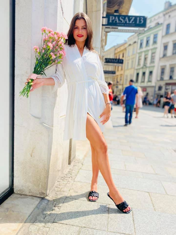 Szlafrok damski z wysokiej jakości wiskozy 94% z dodatkiem elastanu. Krótki, wiązany w pasie, z rękawem 7/8. Mankiety wykończone ażurową koronką.
