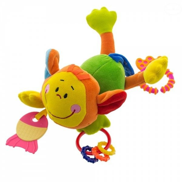 Sympatyczna, miękka małpka, która umili czas zabawy każdemu maleństwu. Do łapek doczepione są kolorowe grzechotki i gryzaczki. Dzięki różnym materiałom z których jest wykonana pomoże rozwinąć dziecku zmysł dotyku, wzroku oraz słuchu. Dostępne są dwie wersje kolorystyczne: niebieska i zielona.