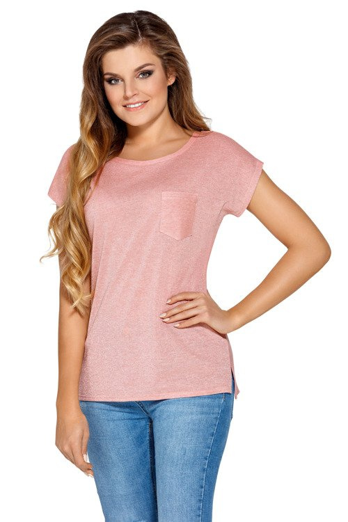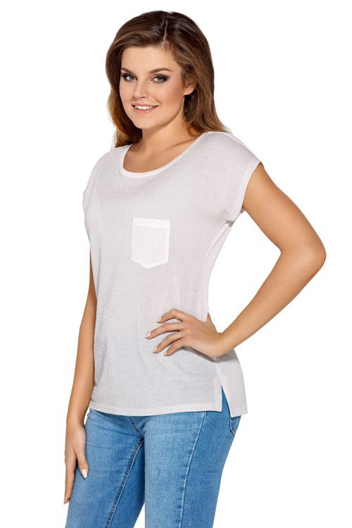 Bluzka damska z krótkim rękawem. Przód z dzianiny z połyskującą nitką lurex, na wysokości piersi naszyta kieszonka. Tył z melanżowej wiskozy, lekko wydłużony, po bokach efektowne rozcięcia. Idealna pod żakiet oraz na wieczorowe wyjście. Powyższy produkt jest wyrobem najwyższej jakości, został zaprojektowany według najnowszych trendów mody.