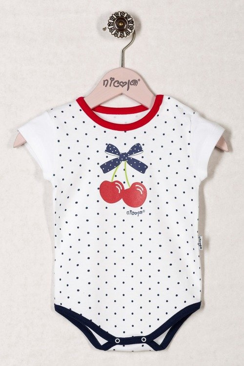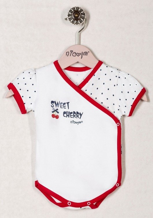 Wakacyjne, praktyczne i wygodne body z kolekcji Wisienki. Wykonane z mięciutkiej bawełny drukowanej bezpieczną farbą wodną. Zapinane na ramionkach i w kroczku na bezniklowe napki. Rozmiar od 52 do 62 kopertowe, od 68 do 98 zwykłe.