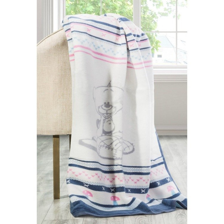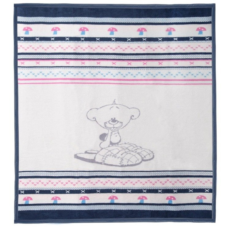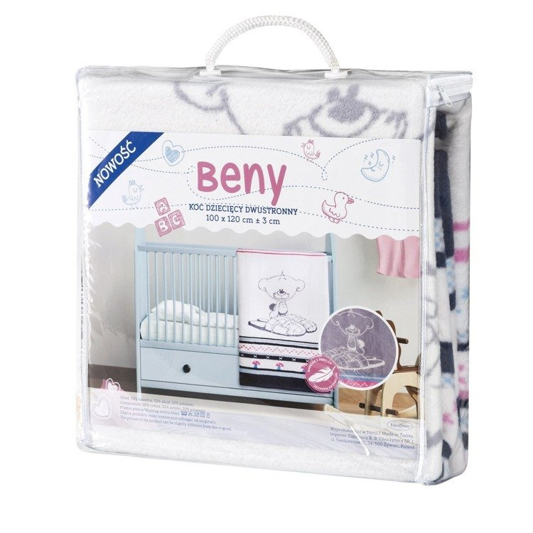 Dwustronny kocyk dziecięcy BENY wykonany z niezmiernie przyjemnego w dotyku połączenia bawełny z akrylem, zachwyca nadrukiem w dziecięcej stylistyce. Obszyto go estetyczną, szeroką lamówką w kolorze granatowym. Znakomicie sprawdzi się w roli miękkiego i przyjaznego okrycia podczas codziennych drzemek oraz spacerków, jak również jako narzuta w łóżeczku dziecka.