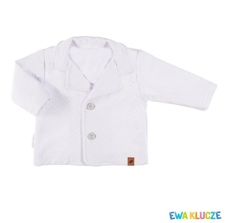 Marynarka chłopięca z kolekcji "Ceremony" uszyta z dotyku białej dzianiny przypominającej pikówkę. Zapinana na guziki. Elementem ozdobnym jest niewielka naszywka wykonana z eko skórki.