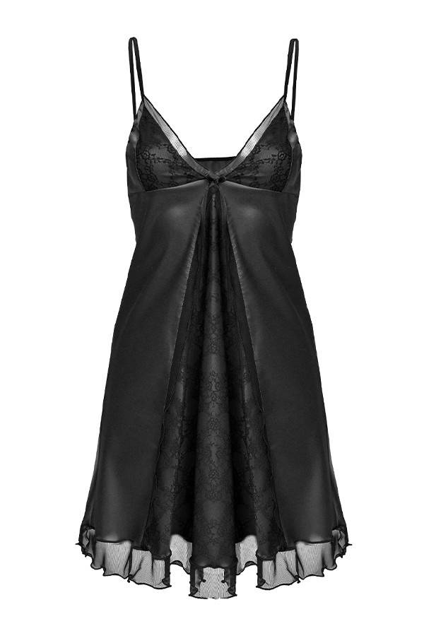 Zmysłowa, urocza satynowa haleczka Helen firmy DKaren. Profilowane satynowe miski ozdobione czarną koronką i tiulową falbanką dodają jej niezwykłego uroku. Środek halki uszyty jest z delikatnej koroneczki podszytej satyną. Dół ozdobiony tiulową falbanką.