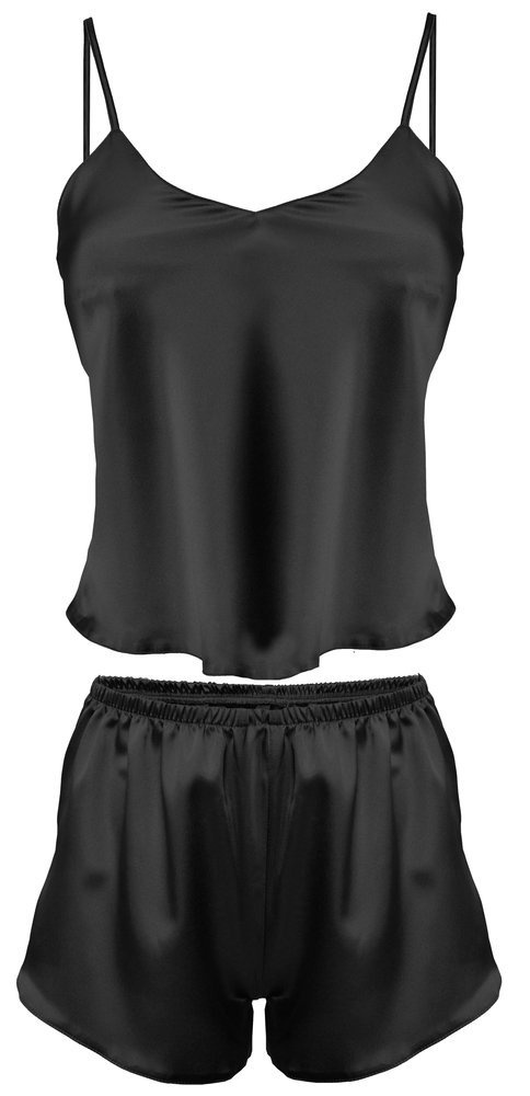 Satynowy komplet Karen firmy DKaren. Składa się z koszulki i spodenek. Przód koszulki tworzy delikatny, trójkątny dekolt. Spodenki na cienkiej gumce, bardzo wygodne w noszeniu.