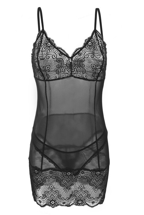 Seksowny komplet Idalia firmy DKaren składa się ze stringów oraz koszulki. Przód tworzą profilowane miseczki wykonane z delikatnej koronki, dół również ozdobiony koronką. Z przodu ozdobna biżuteryjna łezka. Komplet wykonany z najwyższej jakości tkaniny.