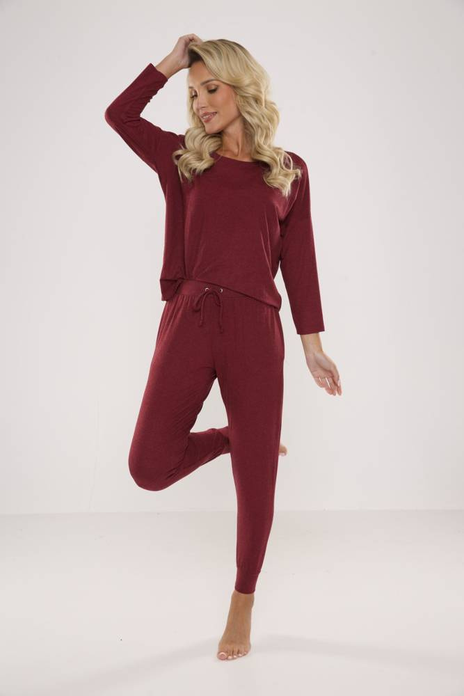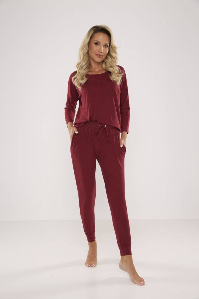 Piżama damska z wysokiej jakości wiskozy z dodatkiem elastanu. Bluza z rękawem 7/8 o luźnym i wygodnym fasonie. Do kompletu długie spodnie z kieszeniami. Pas z szeroką gumą, wygodna gumą obszytą wiskozą. Nogawki zakończone ściągaczem.